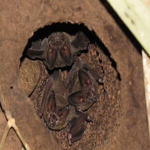 Primeiramente pedimos desculpas pela demora da nossa resposta, mas a baixa resolução da imagem nos levou a discussões que agora nos permitem lhe informar que os dois morcegos na sua fotografia são da família Phyllostomidae, e muito provavelmente do gênero Carollia, o qual inclui espécies de hábito alimentar preferencialmente frugívoro. Já para a identificação da espécie seriam necessárias análises morfológicas de pelo menos um exemplar. No mais, nós agradecemos sua participação.